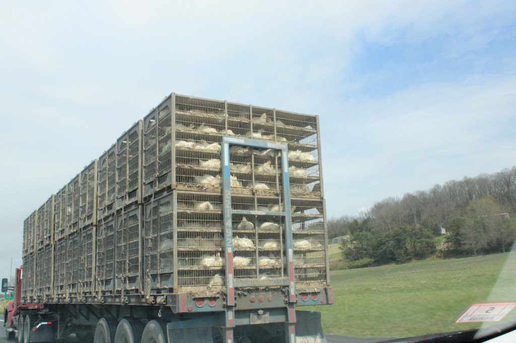 Last but not least, I found myself behind a tractor-trailer at one point in Virginia. It reminded me of a country western song called “Chicken Truck” by John Anderson. I saw these white things coming at me and at first I thought it was the dreaded snowflake but then as I got closer I realized what it was: